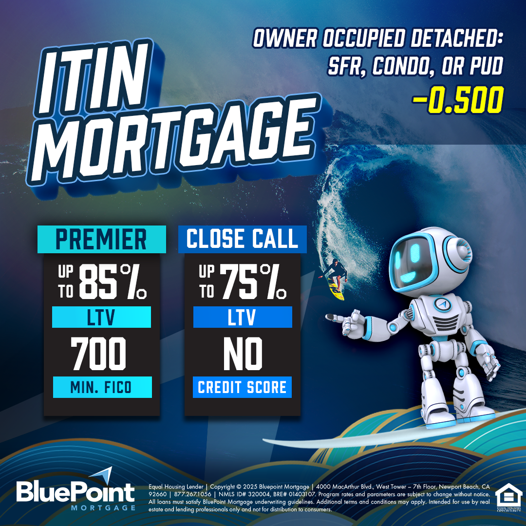 An ITIN mortgage loan is a special type of home loan that allows borrowers to qualify using their ITIN instead of an SSN. This flexible loan option offers low or no FICO score choices, P&L and Full-Doc income verification, and down payments as low as 15%. Additionally, programs like BluePoint Mortgage’s Premier and Close Call options allow for up to 85% LTV with competitive rates and no reserves required.