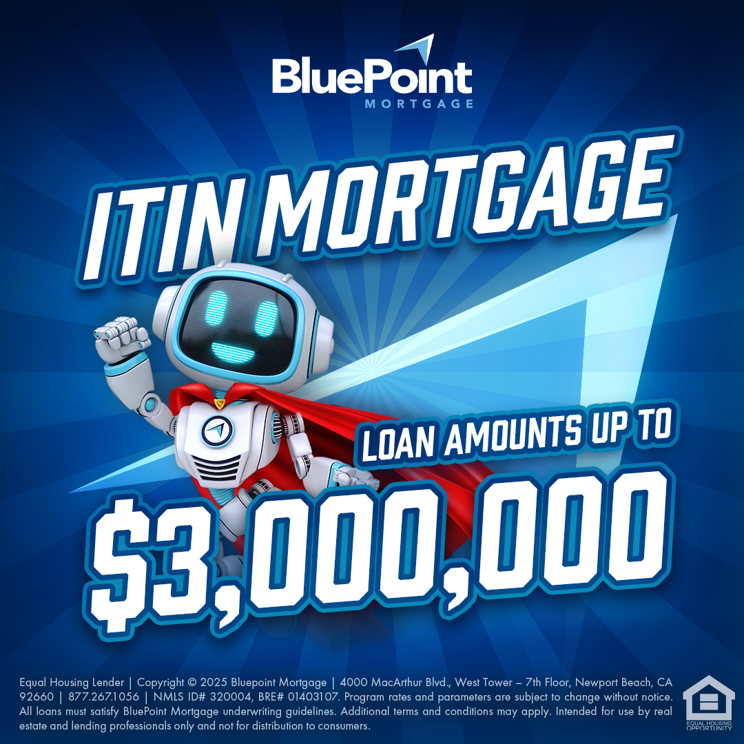 ITIN mortgage loans are available through wholesale mortgage lenders like BluePoint Mortgage—serving mortgage brokers and loan officers across multiple states. If you are a mortgage broker looking to expand your pipeline, or a borrower seeking the best options, BluePoint Mortgage offers flexible ITIN mortgage loan programs with personal service and fast approvals.
